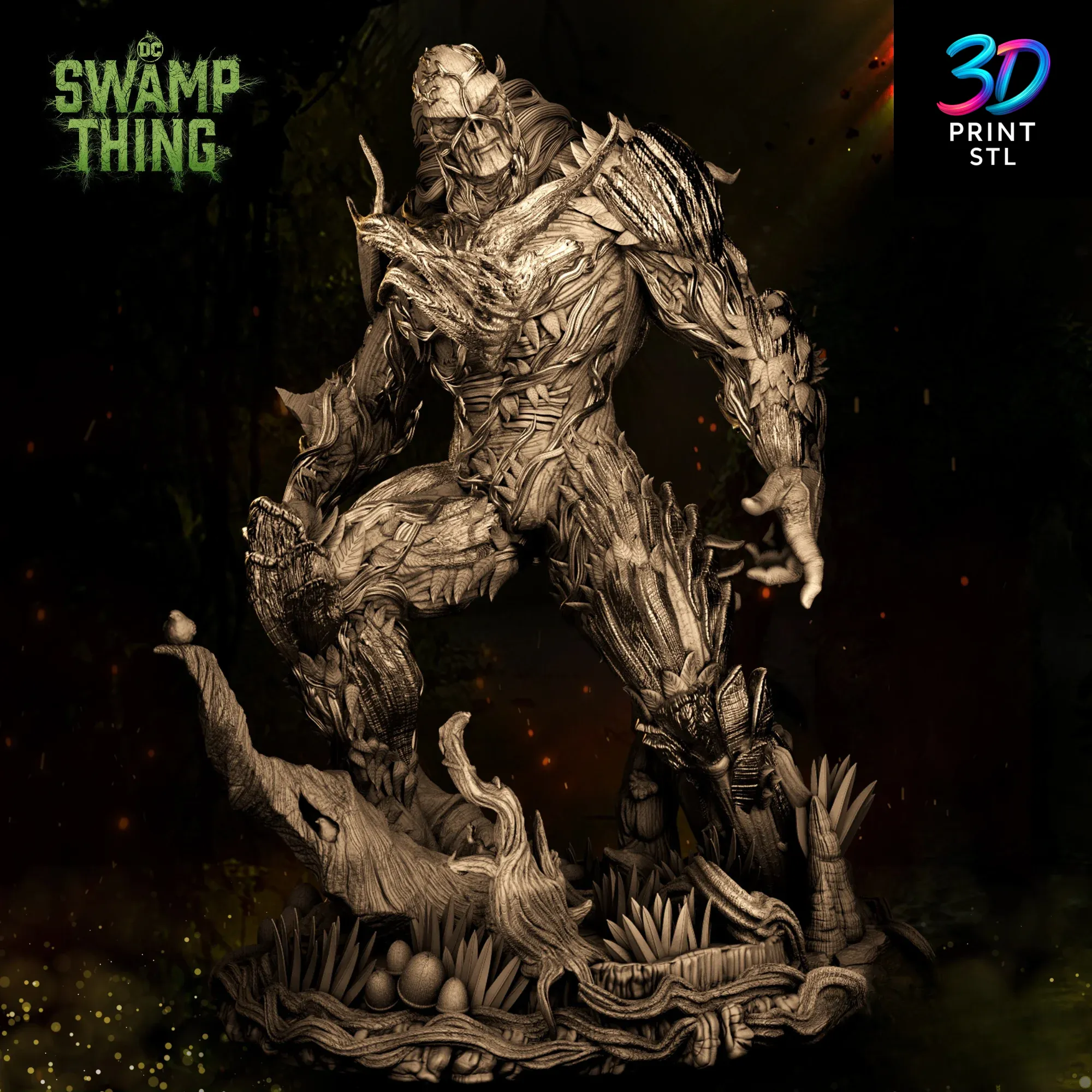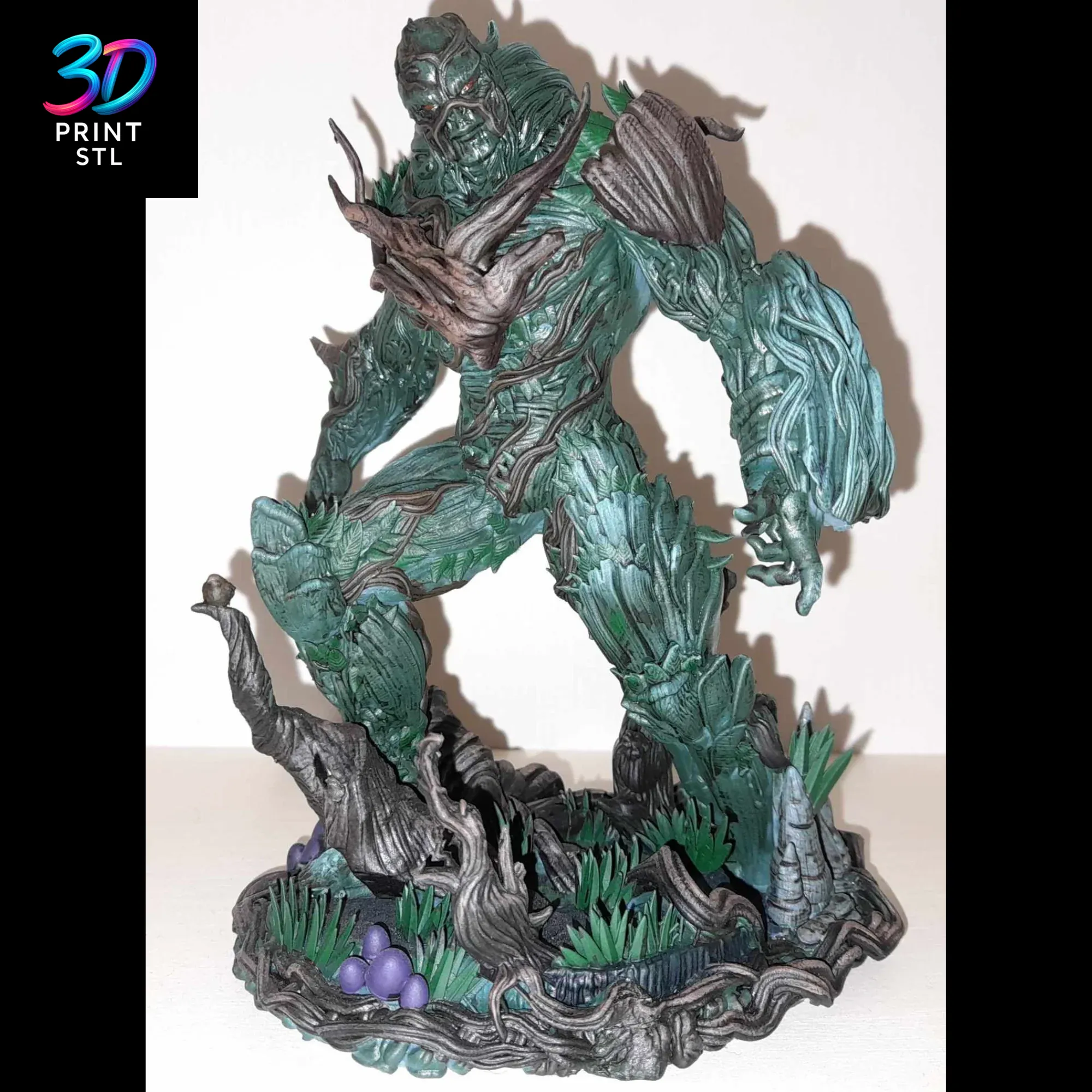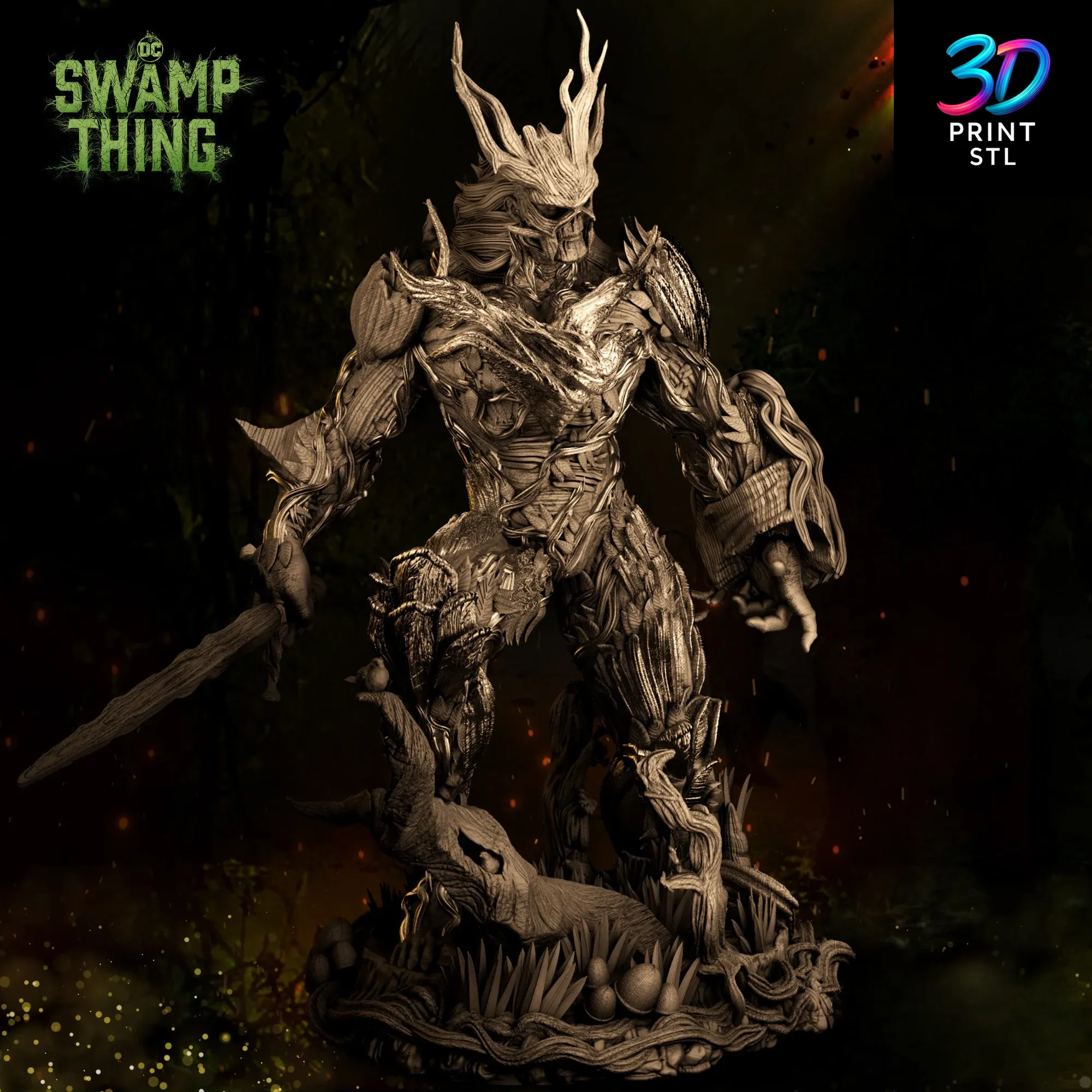 You will receive a package of high-quality STL files for the Swamp Thing DC Comics 3D Print Model, including the main figure, the detailed swamp base, an alternate head with a branch crown, and the variant model wielding a sword.